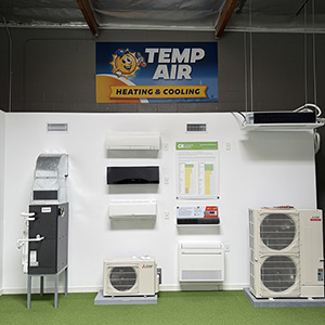 At Temp Air Heating & Cooling, we pride ourselves on offering cutting-edge ductless air conditioning systems from Mitsubishi and Daikin that bring unparalleled efficiency and quiet operation without the need for bulky ductwork. Our showroom has been meticulously crafted to provide you with an immersive experience, showcasing a broad range of models in various settings. You’ll find everything from sleek wall-mounted units to versatile multi-zone systems, each demonstrated in real-life scenarios to help you envision how they might fit into your space.